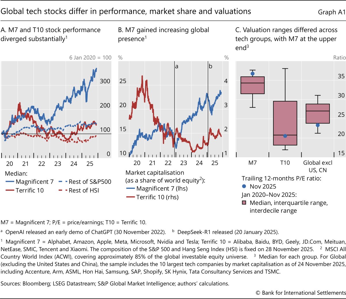 The stocks of US technology firms have risen much faster than the overall market and Chinese counterparts (Graph A1.A). The US "Magnificent 7" (M7) have consistently outperformed the S&P 500, especially since the public release of ChatGPT in late 2022. Such strong gains were underpinned by solid earnings (as discussed in the main text), improved operating efficiency and sustained AI-related investment and demand. These dynamics have strengthened the M7's global footprint, with their share in global equity benchmarks recently approaching one quarter of total market capitalisation (Graph A1.B).