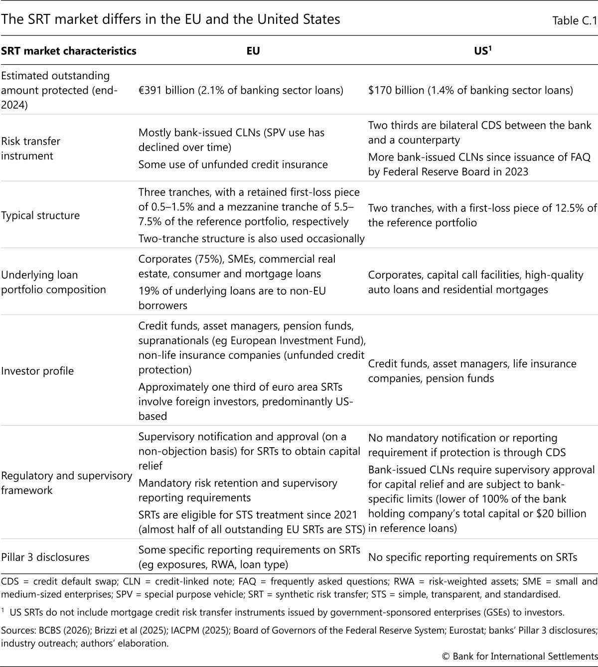 This Annex compares SRT market characteristics in the United States and other jurisdictions such as the EU (Table C.1). In the EU, given the bank-centric financial system, broad adoption of Basel II and III, and supportive regulatory and supervisory framework, banks have long used SRTs to transfer credit risk. The SRT markets in Canada and the United Kingdom are broadly similar to that of the EU in terms of regulatory capital treatment, structural features, loan portfolios and the investor base. In the United States, the existence of deep capital markets for corporate borrowers and the availability of government-supported SME loans may have reduced the need for SRTs for these asset classes, while differences in capital rules have resulted in distinct loan types protected by SRTs. Supervisory notification expectations, reporting requirements and public disclosures also differ across jurisdictions (BCBS (2026)).