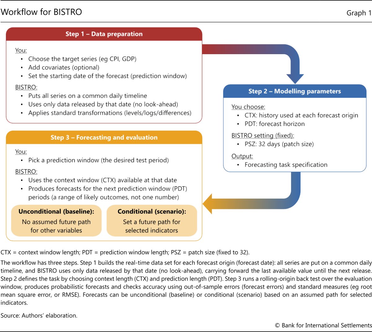 BISTRO was designed as a ready-to-use and off-the-shelf tool for macroeconomic forecasting. This section describes the workflow, which comprises three stages: data preparation, parameter modelling, and forecasting and evaluation (Graph 1). A Google Colab notebook supports replication, with sample scripts and step-by-step code for the entire workflow, including rolling-window forecast generation.