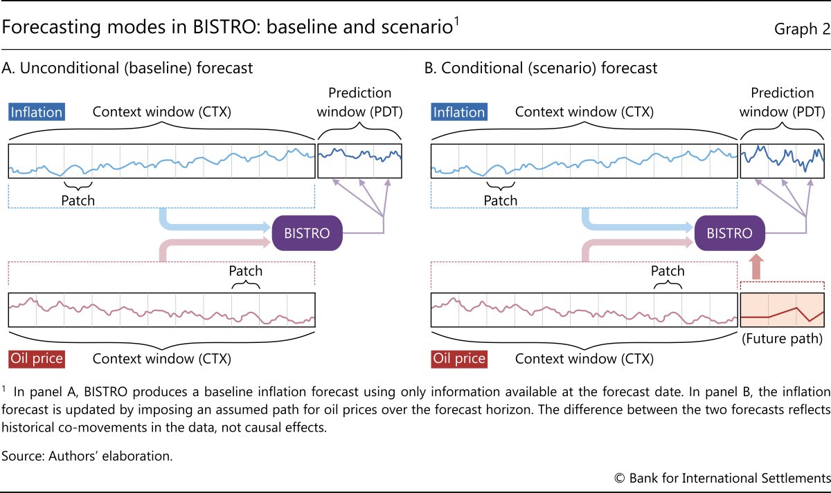 To produce forecasts that also depend on covariates such as oil prices or exchange rates, the user adds these series and aligns them with the target variable. BISTRO then conditions its prediction on both the past values of the target and the explanatory variables (Graph 2.A). BISTRO can also produce conditional forecasts. To this end, the user fixes the future path of one or more covariates and feeds them to the model (Graph 2.B). For example, BISTRO can forecast 2026 inflation under alternative oil price trajectories. This allows researchers to explore different macroeconomic scenarios in a straightforward way.