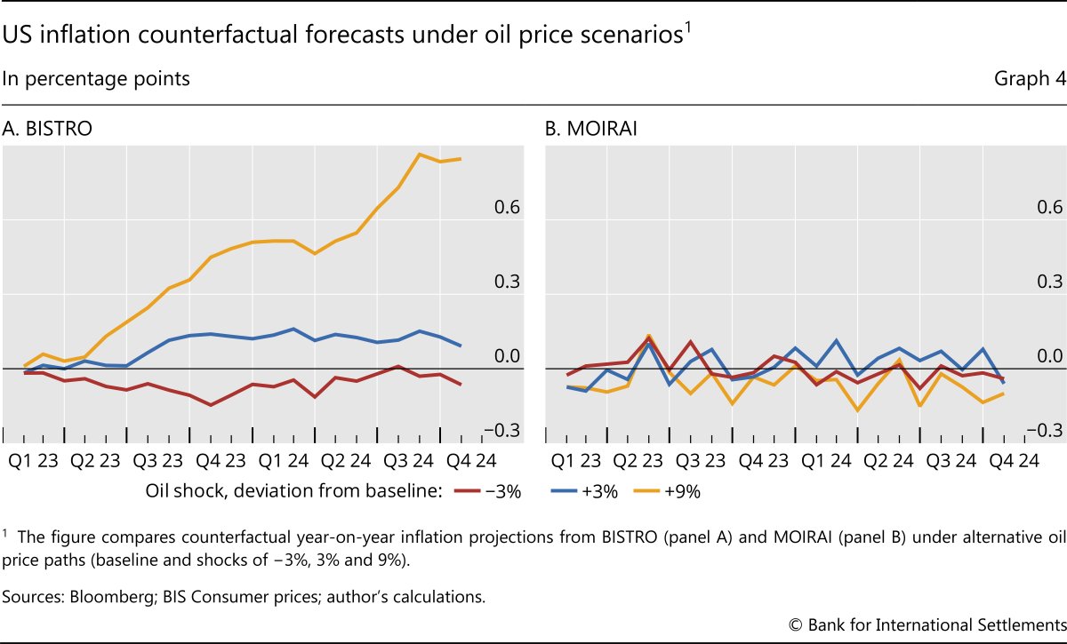 To illustrate this, we consider conditional forecasts of inflation based on different possible future trajectories of the oil price. Starting from its realised path, which serves as a baseline, we introduce counterfactual oil price scenarios in which the oil price would be 3% lower and 3% and 9% higher than it actually was. In general, conditioning on oil prices produces systematically higher or lower oil price paths relative to the baseline (Graph 4.A). But even more importantly, the model unveils a substantial degree of non-linearity in the reaction of inflation to oil prices. First, a decline in the price of oil has smaller medium-run effects on inflation than an increase by the same amount. Second, larger increases in the price of oil have a more than proportional effect on inflation. A clear bearing on the relationship between oil prices and inflation is one of the advantages of our model over MOIRAI. The latter, trained on a wider set of non-macroeconomic time series, fails to highlight any meaningful connection between oil prices and inflation (Graph 4.B).