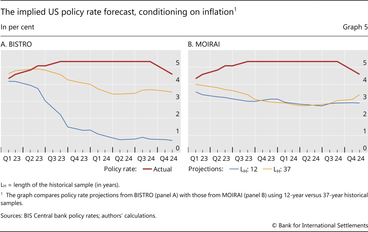 Results crucially depend on the amount of historical information we condition on (Graph 5). When conditioning only on the last 12 years of data in our sample (eg 2011–22), the model uses information based on a low-inflation regime in which monetary policy was mostly conducted through unconventional tools, due to the effective lower bound. Hence, the link between policy rates and inflation appears quite weak. As a result, the model fails to recognise that a policy tightening is necessary to tame inflation and instead hints at near-zero policy rates, implicitly assuming that inflation would self-correct without the need for policy intervention.