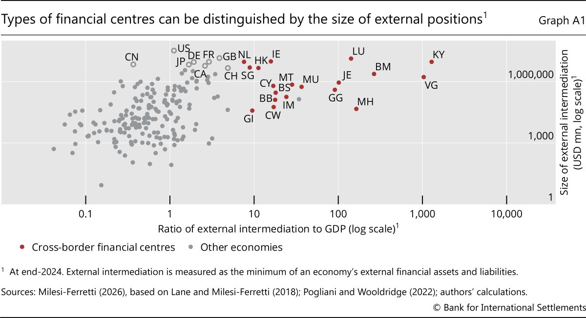 At the opposite extreme are cross-border financial centres (XFCs), which mainly serve non-resident counterparties and consequently have a very high share of international business (Graph A1, red dots). XFCs channel funds between economies, often via entities with a minimal physical presence, such as booking offices, special purpose vehicles and shell companies. They are neither the ultimate source nor final destination for investments and are usually embedded in small economies, as in the case of Bermuda and the Cayman Islands. While some equate XFCs with offshore centres, the latter have come to be associated with low taxes and light financial regulation, characteristics that are neither necessary nor sufficient to attract non-resident business (Pogliani et al (2022)).