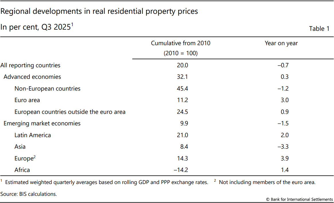 1 Real residential property prices refer to nominal residential property prices (which in Q3 2025 grew by 2.0% globally) deflated by the consumer price index. Global figures are weighted aggregates of selected AEs (Australia, Canada, Czechia, Denmark, the euro area, Hong Kong SAR, Iceland, Israel, Japan, Korea, New Zealand, Norway, Singapore, Sweden, Switzerland, the United Kingdom and the United States) and EMEs (Brazil, Bulgaria, Chile, China, Colombia, Hungary, India, Indonesia, Malaysia, Mexico, Morocco, North Macedonia, Peru, the Philippines, Poland, Romania, Russia, Serbia, South Africa, Thailand and Türkiye), based on PPP exchange rates. Regional aggregates have been available since 2007.